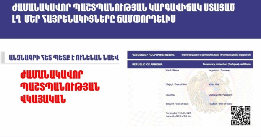 Հունվարի 28-ից ժամանակավոր պաշտպանության կարգավիճակ ստացած ԼՂ մեր հայրենակիցները ճամփորդելիս անձնագրի հետ պետք է ունենան նաև ժամանակավոր պաշտպանության վկայական