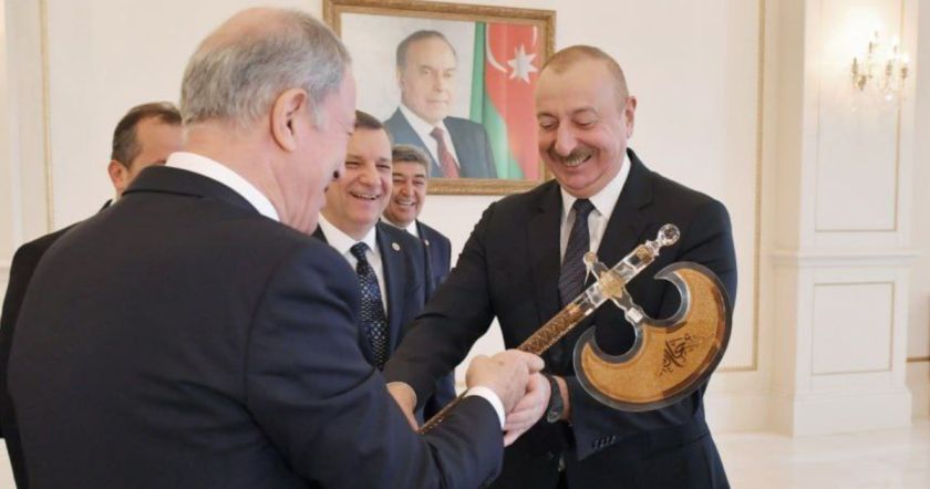 Ենիչերիական այս խորհրդանշական տապարը Բաքվի բռնապետին նվեր է բերել էրդողանական վարչախմբի տխրահռչակ ներկայացուցիչներից Թուրքիայի պաշտպանության նախկին նախարար, այժմ այդ երկրի խորհրդարանի պաշտպանության և անվտանգության հանձնաժողովի նախարար Հուլուսի Աքարը։