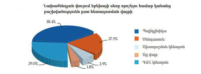 Երեխայի սեռը որոշելու նպատակով կանանց 38.4%-ը դիմել է պոլիկլինիկա, 29%-ը` գերձայնային ախտորոշման ծառայություն, 27.9%-ը ծննդատուն: Փոքր թիվ էին կազմում ախտորոշման կենտրոն կամ այլ վայր դիմած կանայք, համապատասխանաբար 2.9% և 1.8%: