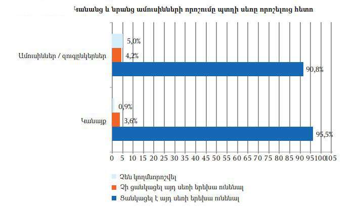 Ընտանիքի որոշումը ավելի մոտ է եղել ամուսինների/զուգընկերների կարծիքին: Ընտանիքը 333 (90.9%) դեպքերում ցանկացել է ունենալ տվյալ սեռի երեխա, 13 (3.4%)- չեն ցանկացել, իսկ 18 (5.0%)-չեն կողմն որոշվել այդ հարցում: