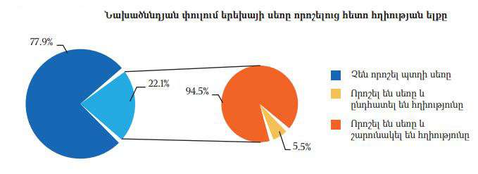 Հղիության ընդհատման որոշում կայացրած 23 կանանցից 19-ը (82.6%) որոշումը կայացրել է ինքնուրույն: Ամուսնու/զուգընկերոջ կողմից որոշումը կայացվել է 18.4%-ի դեպքում: