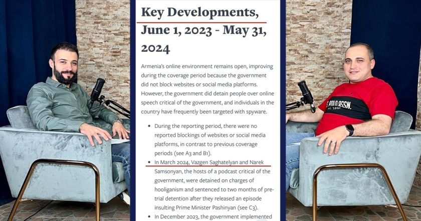 Հ.Գ. “In March 2024, law enforcement officials detained Vazgen Saghatelyan and Narek Samsonyan, who criticized the government on their podcast, Imnemnimi. The hosts were then sentenced to two months in pretrial detention on charges of hooliganism.90 If found guilty, they could face up to five years in prison. Armenia’s Investigative Committee stated that Saghatelyan and Samsonyan committed hooliganism by “showing an openly contemptuous attitude towards moral norms” and swearing at Pashinyan and his cabinet in an episode covering a recent parliamentary session. AntiFake, the media outlet that releases Imnemnimi and has previously been accused by the Atlantic Council of spreading “biased narratives and inauthentic online,” published footage of Samsonyan’s brutal arrest.”