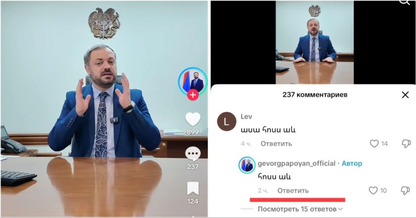 Գևորգ Պապոյանը սոցիալական ցանցի իր էջում հրապարակած տեսանյութի մեկնաբանությունների հատվածում օգտատիրոջ մեկնաբանությանը՝ «ասա հոսս աև», պատասխանել է՝ «հոսս աև»
