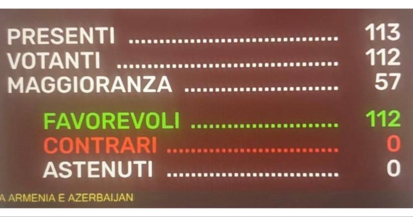 Րոպեներ առաջ Իտալիայի Սենատը միաձայն՝ 112 կողմ ձայնով, ընդունեց «Հայաստանի և Ադրբեջանի միջև խաղաղ գործընթացին աջակցելուն ուղղված նախաձեռնությունների մասին» բանաձևը: Այս մասին X-ի իր էջում գրել է ԱԺ նախագահ Ալեն Սիմոնյանը։