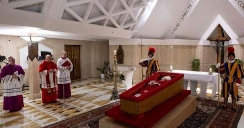 Հռոմի Ֆրանցիսկոս պապի մարմինը Վատիկանի նրա կեցավայրից կարդինալների և շվեյցարացի գվարդիականների ուղեկցությամբ հանդիսավոր կերպով տեղափոխվել է Վատիկանի Սուրբ Պետրոսի տաճար։