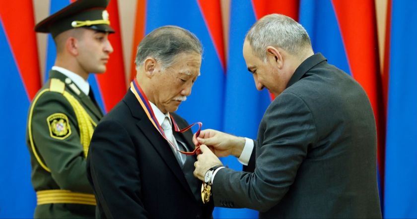 Վարչապետ Նիկոլ Փաշինյանը Բարձր տեխնոլոգիաների ոլորտում համաշխարհային ներդրման համար ՀՀ պետական մրցանակը հանձնել է ճապոնացի գիտնական, AIPLAB կոնսորցիումի հիմնադիր, Արհեստական բանականության գործընկեր համակարգի LOCOMTEC AIPS լաբորատորիայի նախագահ Յոշիակի Դեյմոն Հագիվարային: