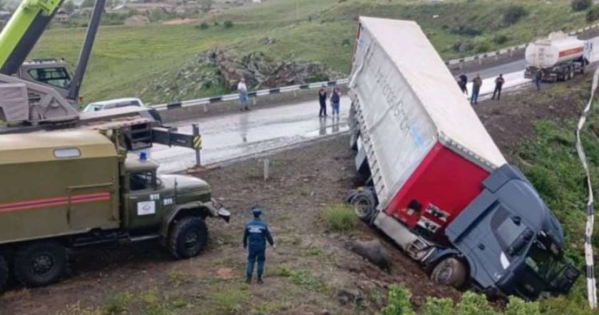 Փրկարարները հատուկ տեխնիկայի (ավտոկռունկ) միջոցով կցորդիչով բեռնատարը ուղղել և դուրս են բերել ճանապարհի երթևեկելի հատված: