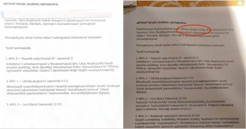 Երեկ իշխանական լրատվամիջոցը հրապարակում է «Հեղաշրջման պլան» ասվածը, որի վրա ինչպես միշտ փնթիավարի փակում է առաջին նախադասությունը: Իսկ այսօր արդեն ԲՆՕՐԻՆԱԿ ասվածի վրա երևում է «միստիկ հեղաշրջման» ամիս ամսաթիվը, որը պետք է իբր տեղի ունենար 2024 թվականի հուլիսի 23-ից սեպտեմբերի 30-ը: