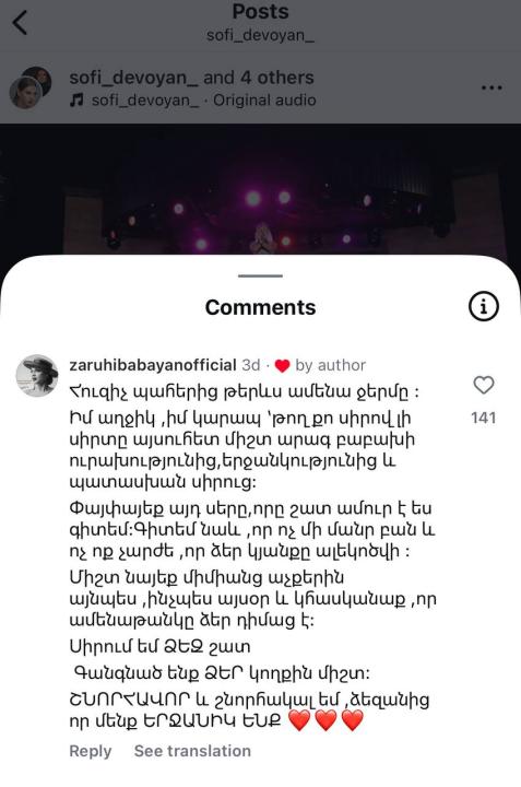 Այս գրառման ներքո մեկնաբանություն է թողել Սոֆիի մայրը՝ երգչուհի Զարուհի Բաբայանը. «Հուզիչ պահերից թերևս ամենաջերմը։ Իմ աղջիկ, իմ կարապ, թող քո սիրով լի սիրտը այսուհետ միշտ արագ բաբախի ուրախությունից,երջանկությունից և պատասխան սիրուց։ Փայփայեք այդ սերը, որը շատ ամուր է ես գիտեմ։ Գիտեմ նաև, որ ոչ մի մանր բան և ոչ ոք չարժե, որ ձեր կյանքը ալեկոծվի։ Միշտ նայեք միմիանց աչքերին այնպես, ինչպես այսօր և կհասկանաք, որ ամենաթանկը ձեր դիմաց է։ Սիրում եմ ՁԵԶ շատ։ Կանգնած ենք ՁԵՐ կողքին միշտ»։