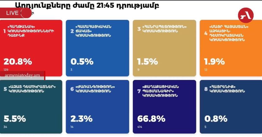 Պառլամենտարիզմի զարգացման միջազհային կենտրոն ՀԿ-ն, որ դիտորդական առաքելություն էր իրականացնում Վաղարշապատօ ՏԻՄ ընտրություններում, օնլայն ռեժիմոց ցույց է տալիս մասնակից քաղաքական ուժերի ստացած քվեները։ Այս պահին ՀԿ ձեռքի տակ են 47 տեղամասերից ընդամենը 2-ի արդյունքները։ Դրանց հիման վրա ՔՊ-ն առաջատար է։