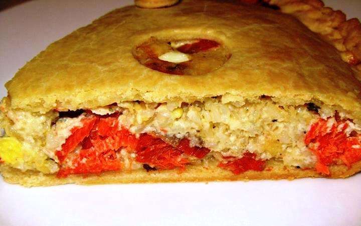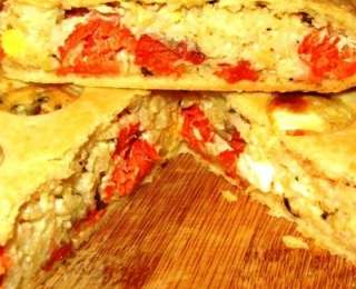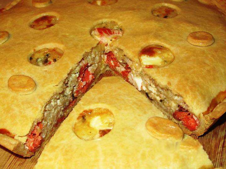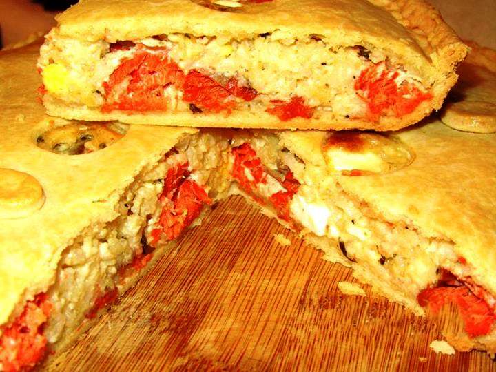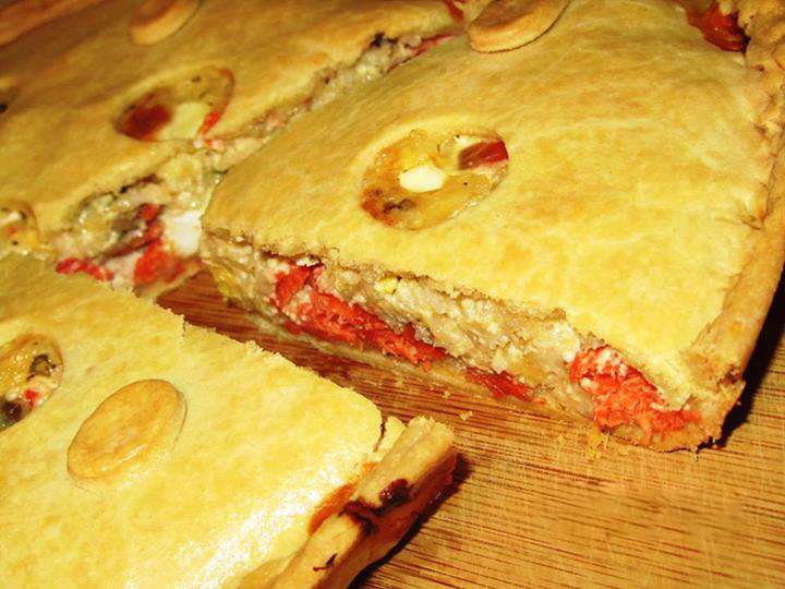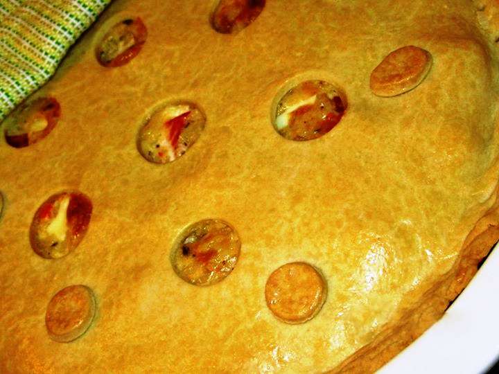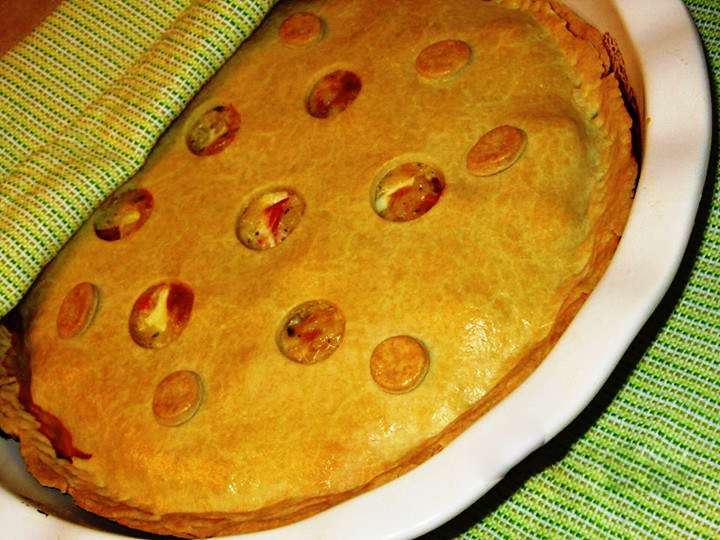 Խմորը բաժանել 2 անհավասար մասերի, մեծ մասը գրտնակել, տեղափոխել կարագով պատված ջեռոցի ամանի մեջ, խմորին տալ ամանի ձևը: Խմորի վրա լցնել միջուկը: Խմորի մյուս մասը գրտնակել, մի քանի հատ անցք անել և ծածկել միջուկը, ամրացնել եզրերը: Այս քանակությունը նախատեսված է 26 սմ տրամագծով կլոր տապակի համար, եթե ձեր տապակը փոքր է, նշվածի կես բաժինը պատրաստեք: Երեսին հարած ձու կամ սերուցք քսել: Հարած ձվով ավելի լավ է կարմրում: Ես սերուցք եմ քսել:
