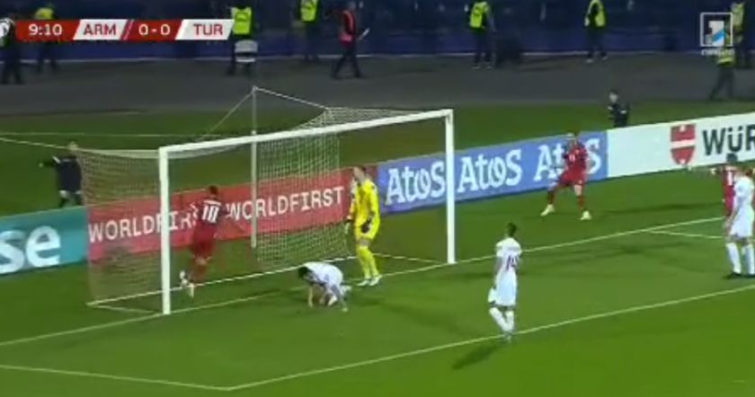 Խաղի արդեն 10-րդ րոպեին մեր ընտրանու հիանալի հակագրոհի արդյունքում Կամո Հովհաննիսյանն աջ եզրում ստացավ գնդակն ու այն փոխանցեց կենտրոն, որ Թուրքիայի հավաքականի ֆուտբոլիստ Օզան Քաբակը գրավեց սեփական դարպասը: