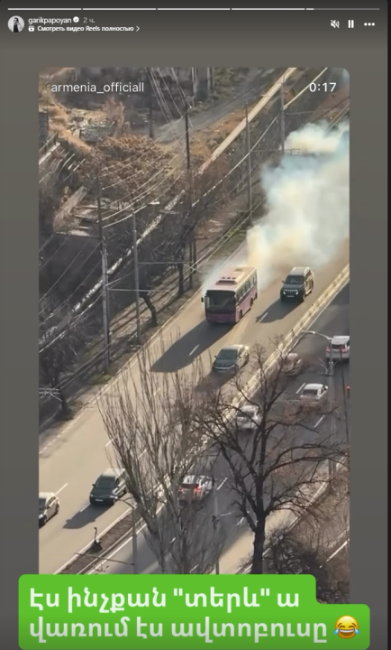 Էս ինչքան տերև է վառում այս ավտոբուսը, այսպիսի գրառմամբ տեսանյութ է տարածել դերասան և երաժիշտ Գարիկ Պապոյանը՝ հումորով անդրադառնալով Երևանում օդի աղտոտվածությանը: Տեսանյութում երևում է՝ ինչպես է Երևանում ընթանում առատ ծուխ արձակող ավտոբուսը: