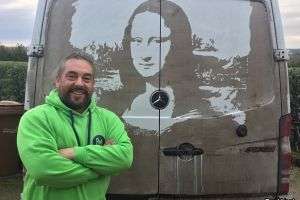 Мужчина рисует красивые картины на своем грязном автомобиле