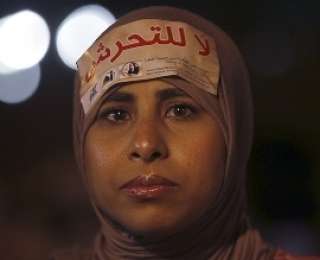 На фото египетская женщина в знак протеста носить надпись на голове: " Нет преследованиям ".