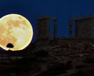 Суперлуние над храмом Посейдона, Греция