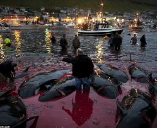 Ежегодно в Шотландии у берегов Фарерских островов происходит охота и массовый забой черных дельфинов и китов. В этом жутком мероприятии принимают участие десятки лодок, которые загоняют группу животных в бухту, а рыбаки забивают их.