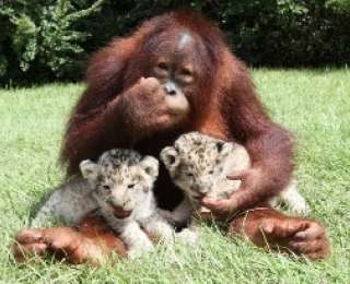 В одном из зоопарков американского штата Южная Каролина живёт необычная обезьяна.Орангутан по кличке Ханама стал настоящим папой для львят.