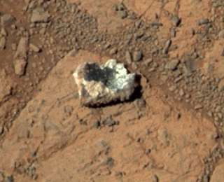 Работающие с аппаратом ученые сделали фото камня крупным планом. На нем хорошо видно, что одна сторона камня темного цвета со светлыми вкраплениями, а другая покрыта марсианской пылью. По одной из версий, камень мог толкнуть манипулятор марсохода во время работы.