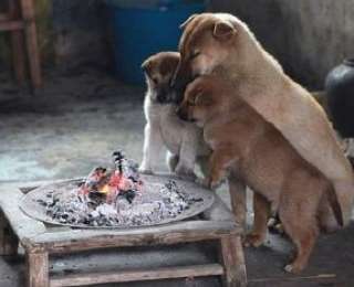 Действие проходило в Китае, в Jiulongjiang Forest Park. Животные забились в заброшенную столовую, где их и нашли работники. Чтобы собаки окончательно не замерзли, люди устроили им импровизированный костер. Щенки с появлением источника тепла перестали выть и дружно сгруппировались вокруг тлеющих углей. Причем никто из них не лез в костер, не отпихивал соседа, не переворачивал импровизированный очаг. Собаки вели себя очень организованно и дружно.