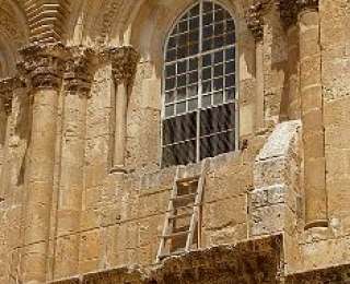 Дело в том, что деревянная лестница, приставленная к правому окну фасада Храма Гроба Господня опирается на карниз, принадлежащий Греческой православной церкви, и приставлена к окну, находящемуся во владении Армянской апостольской церкви. Нахождение лестницы на своём месте означает соблюдение соглашения между шестью христианскими конфессиями, владеющими храмом, — не двигать, не ремонтировать и не изменять ничего в храме без согласия всех шести конфессий. Лестница является одним из символов разногласий в христианстве.