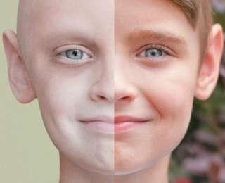 На фото лицо Ноя разделено на две части, с левой стороны — смертельно бледный, истощенный и лысый 4-летний пациент, подвергающийся химиотерапии, а с правой — здоровый и счастливый 7-летний парень.