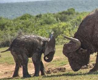 Как любой молодняк, слоненок был очень любопытным и решил "познакомиться" с быком