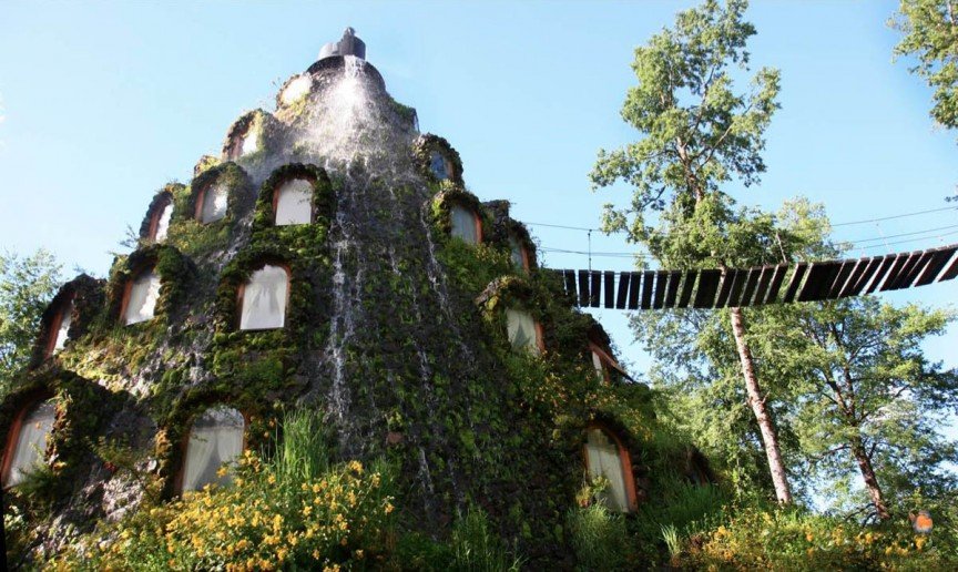 В отеле Волшебная Гора всего тринадцать-пятнадцать номеров и выглядит он так, будто сошел с экранов фильма о «Властелине колец». Он находится в отдалённом Биологическом Резервате Хуило-Хуило (Huilo-Huilo Biological Reserve) в северной области Чили, известной как Патагония. Посетители входят в отель по подвесному веревочному мосту, затем они попадают под брызги воды, падающей с конусообразной зелёной крыши. Как вы уже догадались, название происходит от любимой книги владельцев. ![]()
