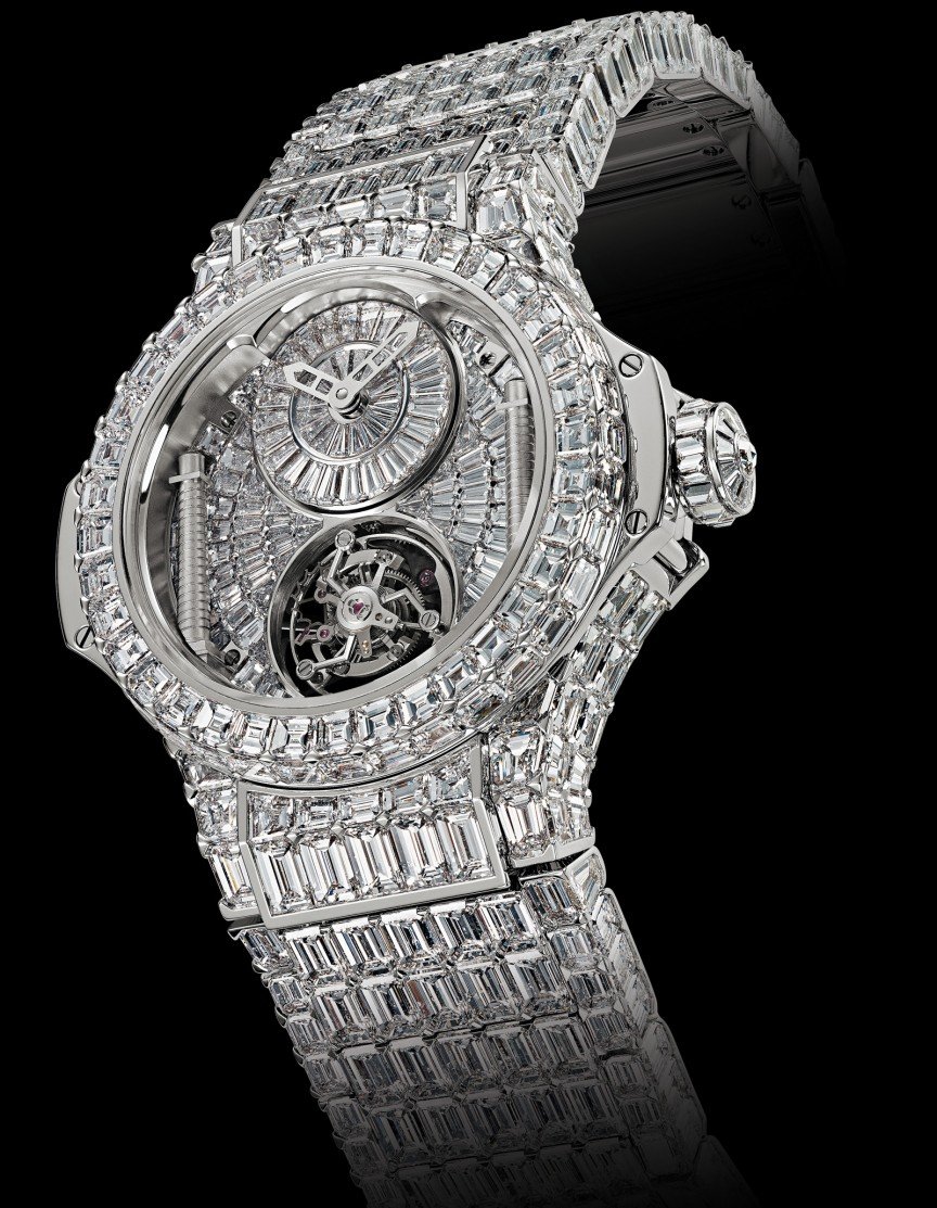 Если Пьяже и научил нас чему-то так это тому, что если вы хотите увеличить стоимость наручных часов, вам придётся нацепить на них много алмазов. Хублот взял эту формулу на вооружение и применил её в своём дизайне. Швейцарский производитель часов взял одну из своих «стандартных» моделей часов «Большой Взрыв» в качестве шаблона и занялся поиском алмазов правильных размеров, чтобы спроектировать и изготовить очень высококачественную версию этого шаблона. В результате получились часы, инкрустированные 1282 алмазами, обработанными режущим инструментом с особо высокой точностью, более 100 каратами алмазов огранки «багет» и шестью алмазами изумрудной огранки, весом более 3 карат каждый. Конечная цена составила колоссальные 5 миллионов долларов. Эта цена слишком высока для большинства из нас, но не для Бейонсе Ноулз (Beyonce Knowles). Певица купила эти часы для своего мужа, Jay-Z, на его 43-й день рождения.