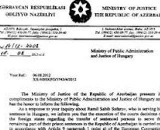 Согласно письму, поскольку осужденный на пожизненное заключение в 2006 г. Сафаров провел в венгерской тюрьме 6 лет, он, по азербайджанским законам, должен был продолжить нести наказание в Азербайджане.