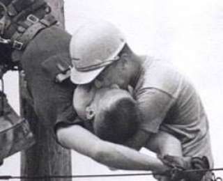 На этой фотографии изображены два электрика Рэндалл Чемпион (Randall Champion) и Джей Ди Томпсон (J D Thompson) на верху столба электропередач. Они проводили профилактические работы, когда Чемпион коснулся одной из высоковольтных линий. Это те линии, которые просто жужжат электричеством. Более 4000 вольт прошло через тело Чемпиона, и электрический шок остановил его сердце (даже на электрическом стуле используется всего 2000).