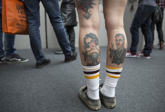 Женщина демонстрирует свои татуировки на ногах во время 10-го международного слёта, посвящённого татуировкам, в Лондоне 27 сентября 2014 года. (Фотография Нила Холла/Рейтер)
