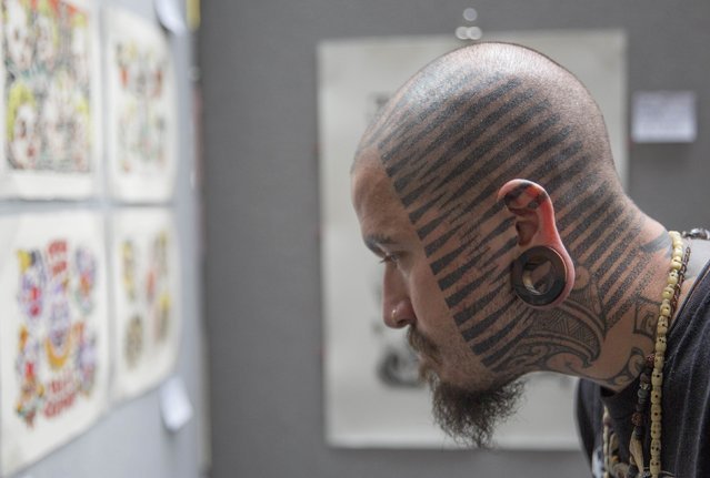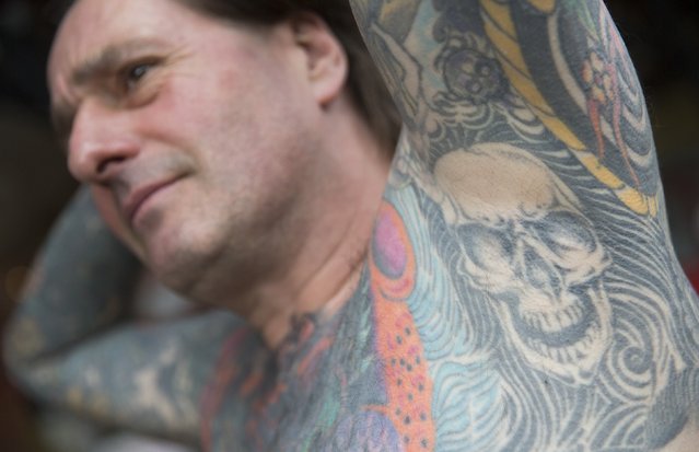 Мужчина позирует, демонстрируя свои татуировки во время 10-го международного слёта, посвящённого татуировкам, в Лондоне 27 сентября 2014 года. (Фотография Нила Холла/Рейтер)