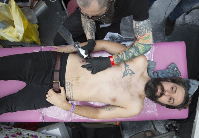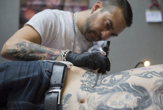 Мужчина получает татуировку во время 10-го международного слёта, посвящённого татуировкам, в Лондоне 27 сентября 2014 года. (Фотография Нила Холла/Рейтер)