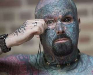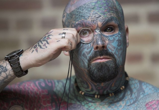 Мужчина, сменивший своё имя на Король Мира Чернил Король Боди-Арта Экстремальные Татуировки (King of Ink Land King Body Art The Extreme Ink-ite) поправляет свой монокль, позируя во время 10-го международного слёта, посвящённого татуировкам, в Лондоне 27 сентября 2014 года. (Фотография Нила Холла/Рейтер)