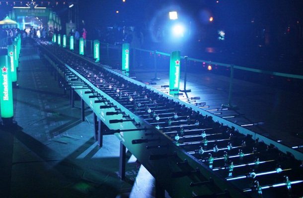 Длина обычного стола для настольного футбола составляет приблизительно 121 сантиметр. За таким столом могут играть 4 человека. Однако этот стол, сделанный для соревнования по настольному футболу (2013 Heineken UCL Foosball Competition), которое прошло в 2013 году в парке Сямынь Хайван (Xiamen Haiwan Park), Китай и спонсировалось компаний «Heineken», был почти 40 метров в длину и разработан таким образом, чтобы за ним одновременно играло сто человек.