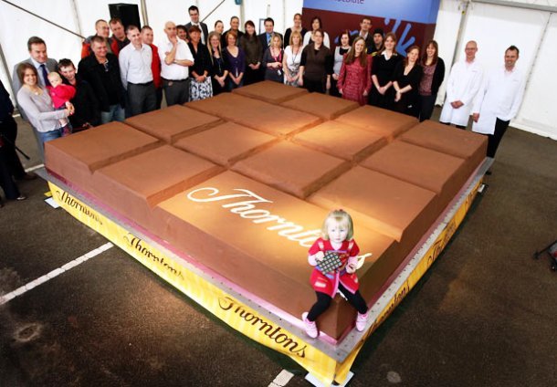 Самая большая плитка шоколада в мире была создана компанией «Thorntons plc» в городе Алфретон (Alfreton), графство Дербишир (Derbyshire), Великобритания, в октябре 2011 года. Она весила 5792 килограмма 374,10 грамма, и её размеры составляли 4 на 4 на 0,35 метра.