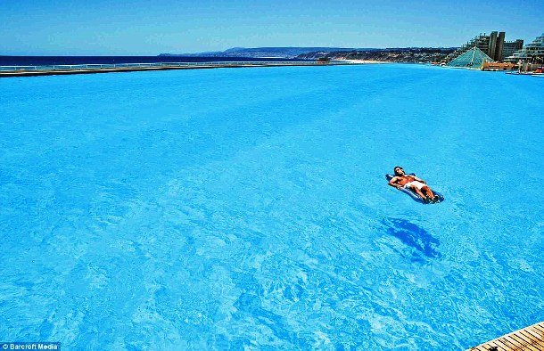 Самый крупный плавательный бассейн под открытым небом находится на курорте Сан Альфонсо дель Мар (San Alfonso Del Mar Resort) в Чили. Его размеры просто поражают. Он занимает площадь в 8 гектаров 937,13 квадратных метров. Его длина превышает 914,40 метров, глубина равна 35,05 метра и вмещает он 249 837,17 кубических метров воды.