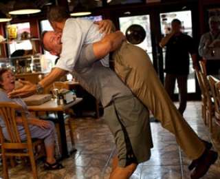 Горячий прием ожидал президента США Барака Обаму в пиццерии Big Apple Pizza & Pasta Restaurant в городе Форт Пирс, штат Флорида. Владелец ресторана, приветствуя политика, крепко обнял его и поднял высоко над землей.
