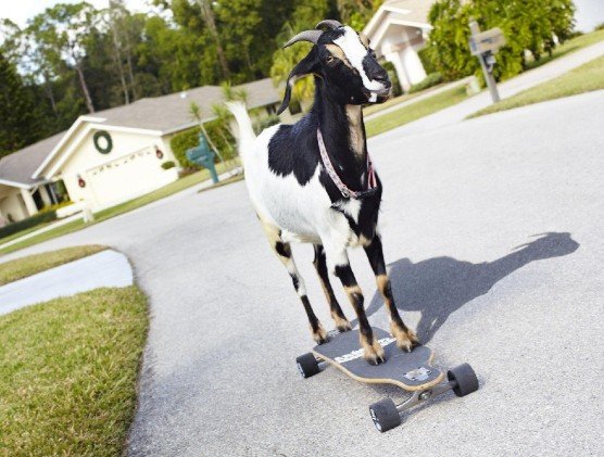 Некоторые считают Хэппи довольно экстремальной козой – она знаменитая скейтбордистка! В марте 2012 года Хэппи проехала 36 метров всего за 25 секунд, самое большое расстояние, преодолённое козой на скейтборде. Её владельцы зачастую помогают ей кататься, идя перед её скейтбордом и маня её угощениями для концентрации её внимания на поставленной цели. На самом деле Хэппи потенциально может проехать ещё дальше, ведь тот заезд, в котором она побила рекорд, был остановлен только потому, что она врезалась скейтбордом в парковочное ограничение. Помимо скейтбординга Хиппи также может пожимать руки и, по словам её семьи, является отличным домашним любимцем. Вполне возможно, что она могла дать фору самому Тони Хоуку (Tony Hawk).