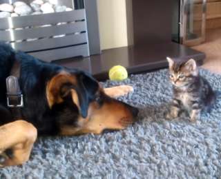 И пусть эта собака в 20 раз больше, этого «ути-пути» котика, она уже не знает, что придумать, чтобы обратить его внимание на себя.