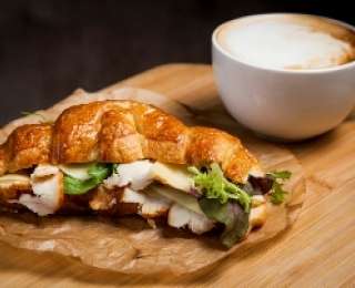 Смазать внутренность круассана соусом цезарь, выложить салат романо, куриную грудку и сыр. Блюдо готово.