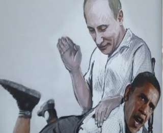 Картина художника Виталия Подвицкого. Эта карикатура и две ниже (в частности, художников из сообщества «Студия 13») демонстрировались 31 октября на московской выставке "Без фильтров", организованной патриотическим движением "Молодая Гвардия"