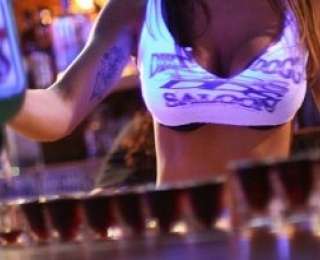 − Ой, бармен, а акция еще актуальна, − девушки показывают на табличку, в которой за демонстрацию обнаженной груди, обещают колу с виски.− Нет, мы не готовы, мы трезвые и серьезные девушки. Но может быть.