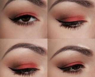 4. Красный цвет теней наносим на подвижное веко, стараясь не заходить в зону внутреннего уголка, в противном случае глаз будет казаться "заплаканным".