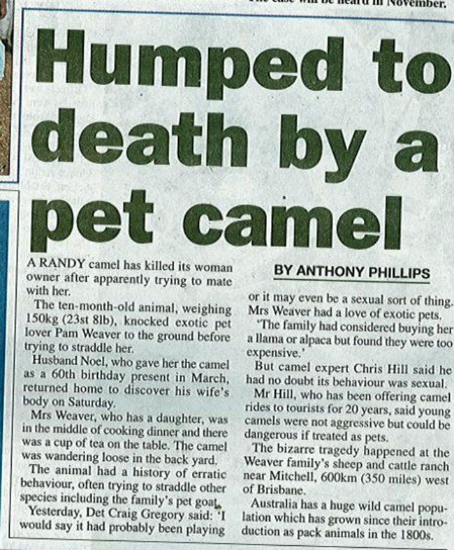 Шестидесятилетняя австралийка получила в подарок верблюда на своё 60-летие. Несмотря на то, что этот подарок на день рождения может показаться несколько странным, его сложно было счесть опасным, особенно учитывая тот факт, что у женщины было обширное именье и большое поголовье крупного рогатого скота и овец. Был ли верблюд на самом деле странным или же просто ему не нравилось общаться с другими животными, разгуливавшими по частым владениям Пэм Уивер, остаётся неясным, однако верблюд много раз пытался убить домашнюю козу семьи. Однажды вечером верблюд попытался спариться с Уивер. После того как Уивер попыталась отбиться от своего подарка на день рожденья, верблюд сбил её с ног, наступил ей на голову и лёг на неё сверху, задушив её. Следы его копыт были обнаружены на лице и руках Пэм Уивер.