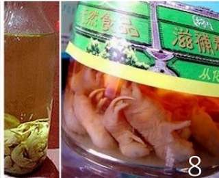 Непонятно, откуда у азиатов такая страсть к напиткам, настоянных на трупах, но этот пункт посвящается рисовому вину, настоянном в течении года на трупиках новорожденных мышей. Говорят, что этот «напиток для здоровья» на вкус как бензин. Если Вам жалко мышат, попейте 95-ого.