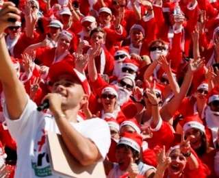 Тысячи участников пробега, в костюмах Санта-Клауса позируют для групповой фотографии после завершения годового предрождественского мероприятия в Дарлинг Харбор Сиднейского оперного театра, 7 декабря 2014 года. Ежегодное мероприятие проводится для сбор средств для оказания помощи детям из неблагополучных семей.