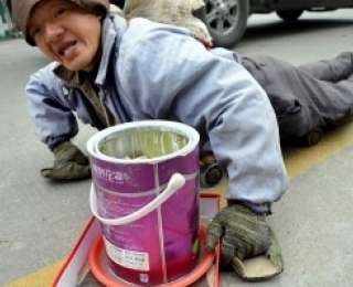 На улицах китайского города Венлинг, что находится в провинции Чжэцзян, этот мужчина просит милостыню, передвигаясь на небольшой тележке. В конце рабочего дня происходит чудесное исцеление, и бывший инвалид встает на ноги и терпеливо ждет автобус на остановке.