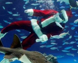 Южнокорейские водолазы, одетые в костюмы Санта-Клауса плавают с сардинами на аквариуме в Сеуле, в Южной Корее. Несмотря на то, официальной религией в Южной Корее является буддизм, около 30 процентов населения исповедуют христианство и Рождество является одним из самых больших праздников, который будет отмечаться в Южной Корее.